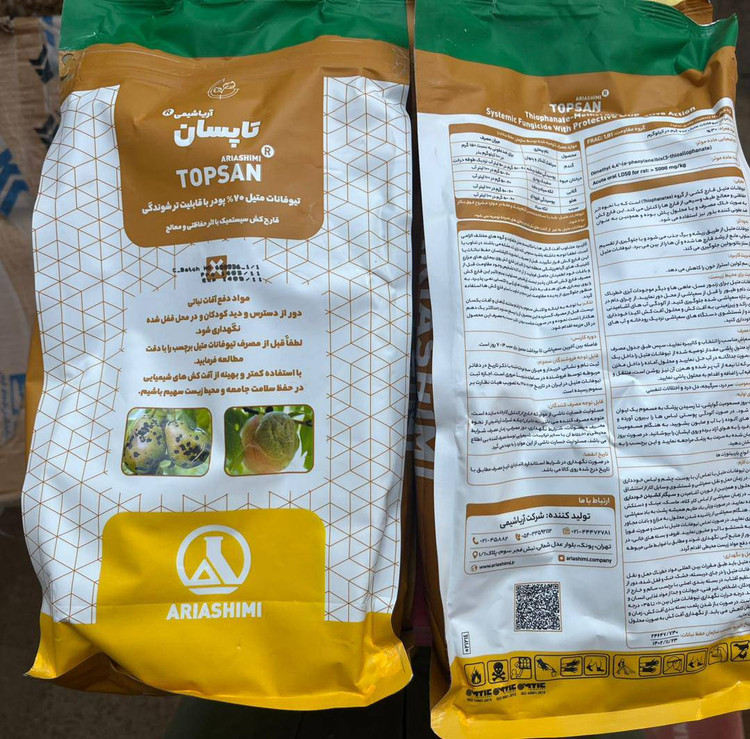 - ماده فعال توپسین، Thiophanate‑methyl است، با غلظت معمولاً «۷۰٪ WP» (پودر قابل حل در آب).